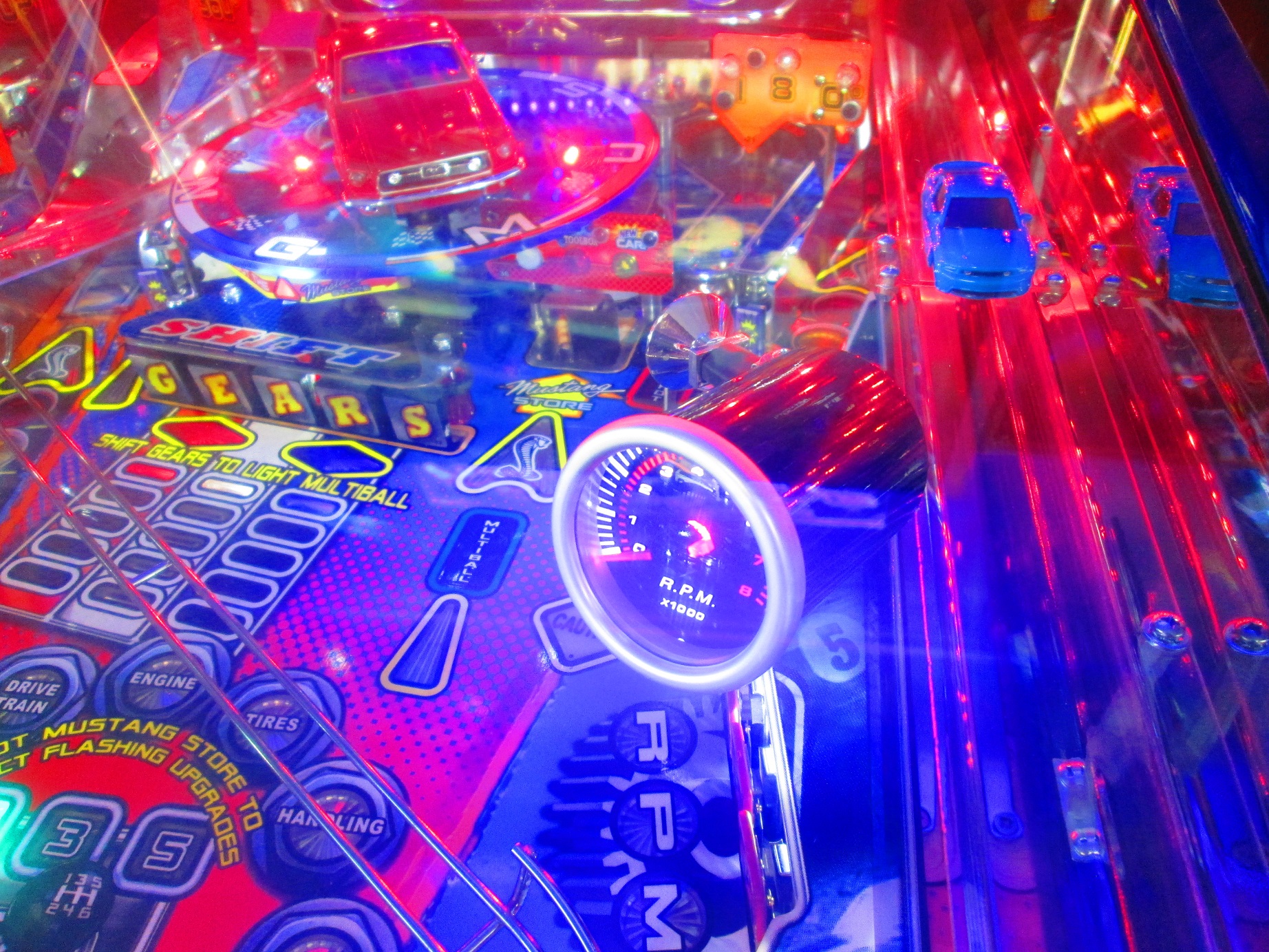 There’s a long list of mods that come with this game, including a custom shooter rod, a cool new shifter plate, mirror blades, 351 Cleveland in-lane covers, a tachometer mod, a dashboard mod, the laser-cut topper, updated software, and a Pinnovators volume control/headphone jack/subwoofer connector.