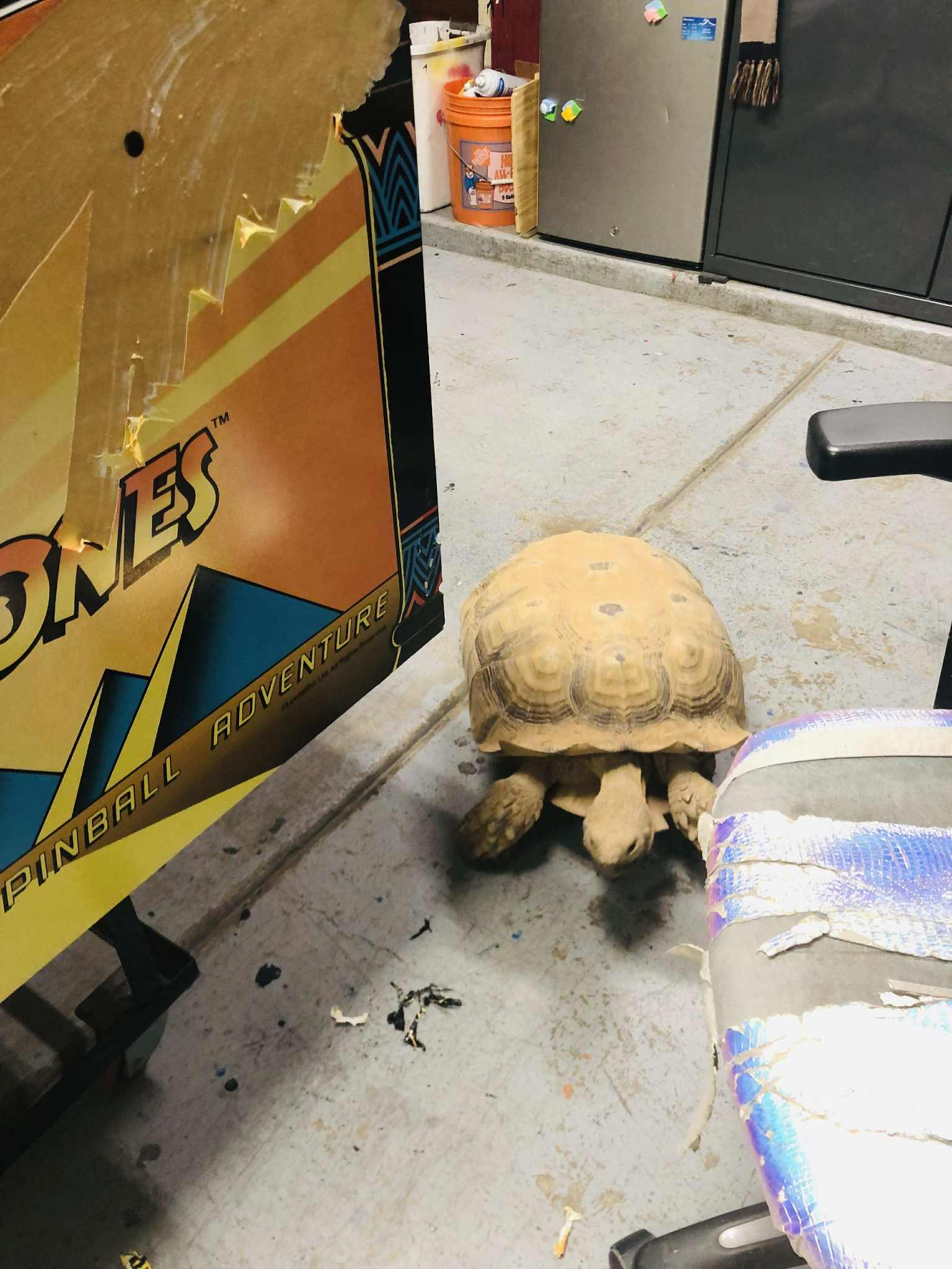 Speedy is a Sulcata tortoise we took in about eight years ago. He lives in our backyard and trims the grass to earn his treats. And apparently he wants to help fix pinball machines too!
