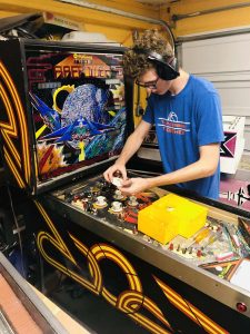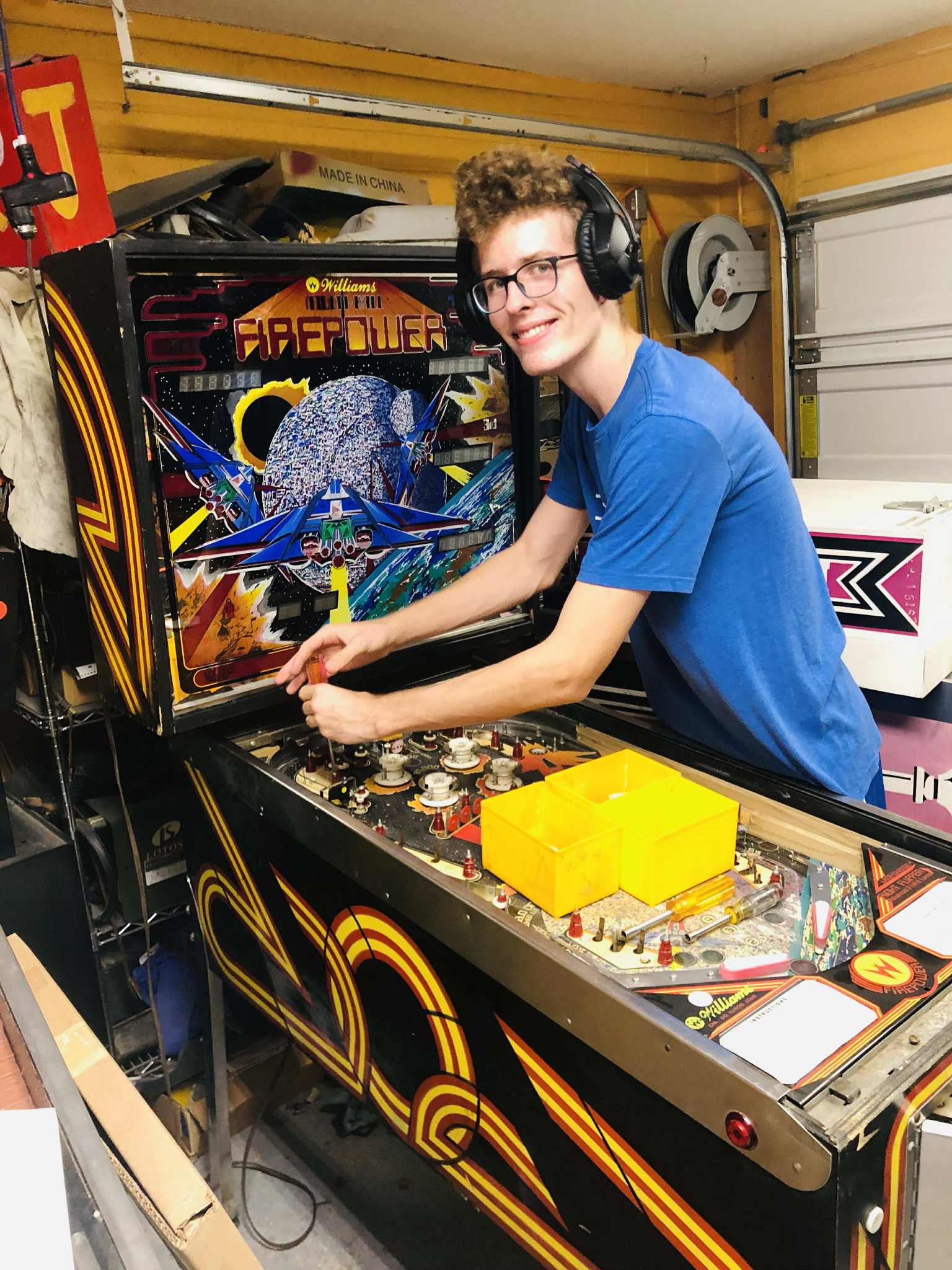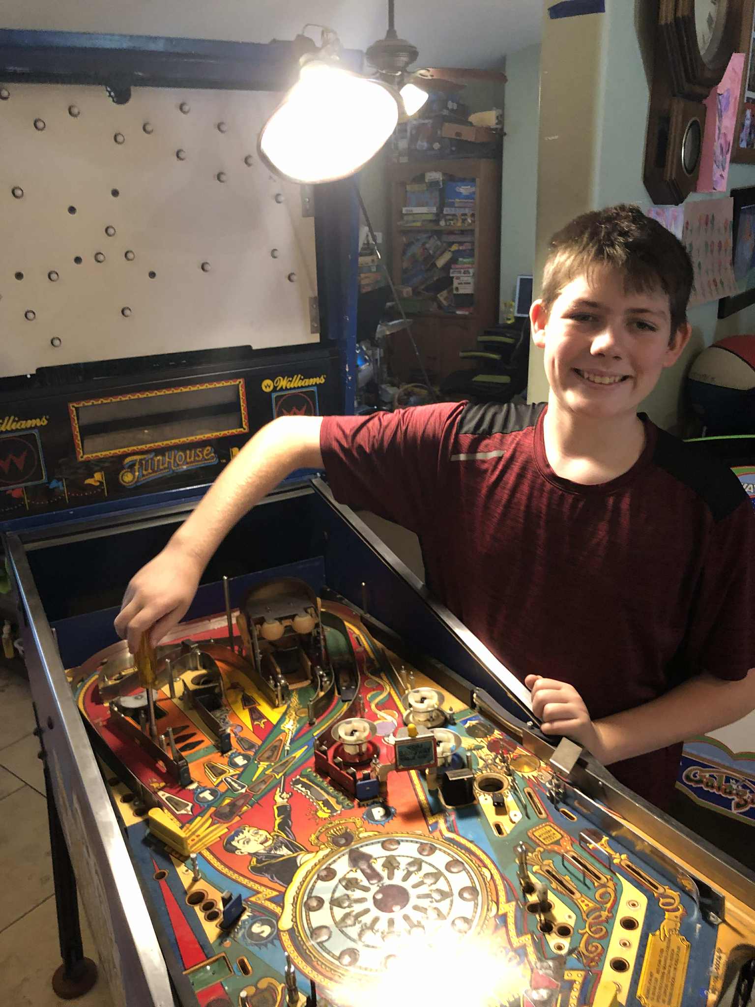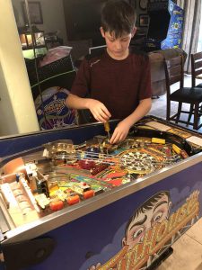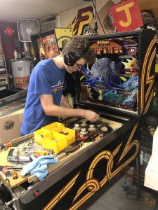 There’s our junior intern hard at work, too, stripping the playfield of this Funhouse pinball machine.